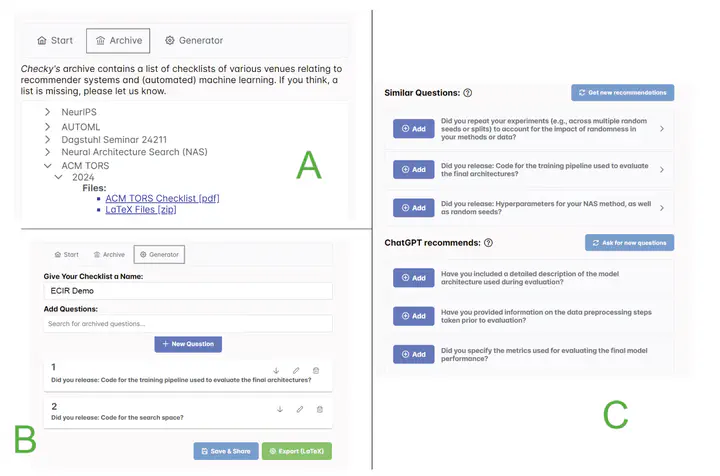 Submission checklists have become increasingly prevalent for paper submissions to conferences and journals in machine learning research. These checklists typically focus on the rigor of evaluations. They communicate to authors what the venue expects and aid reviewers in assessing the rigor of the research. The recommender-system community has made its first attempts to adopt such lists, but not as widely and comprehensively as the machine learning community. Therefore, we introduce Checky, a paper-submission checklist generator, archive, and recommender system. Checky is web-based, open source, and features an archive of checklists and a checklist generator with a recommender system. We hope that Checky (a) stimulates a discussion within the recommender systems community about whether and how submission checklists should be implemented and (b) facilitates the creation and management of checklists.